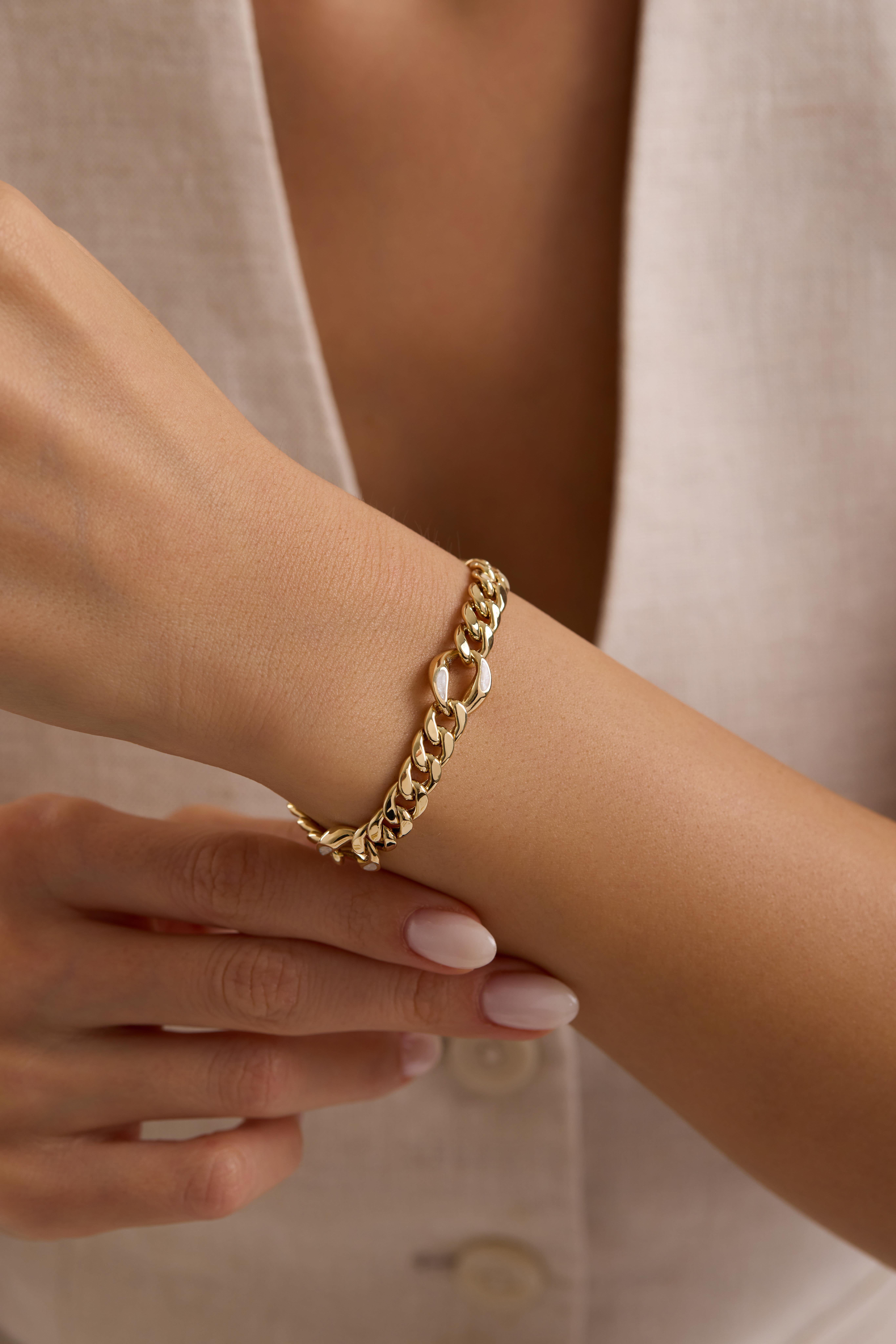 Stella Blanc Bileklik Ağırlık : 11,35 gram Uzunluk 18+3 cm Belirtilen ağırlıkta (+/-) 0.10 gram sapma görülebilmektedir.; Altın ayarı: 14 ayar altın (585k) Üzerinde altın damga ve patenti bulunmaktadır.;